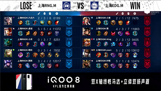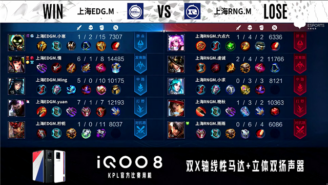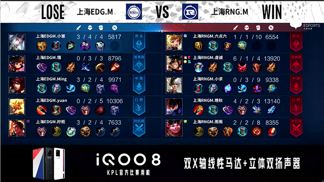 2分12秒,上海RNG.M控下暴君,上海EDG.M控下先知主宰。2分21秒,上海RNG.M廉颇击杀夏侯惇拿下一血。5分18秒,上海RNG.M橘右京击杀虞姬。5分42秒,上海RNG.M破掉上海EDG.M下一塔。6分27秒,上海RNG.M控下暴君。6分39秒,上海RNG.M嫦娥击杀镜。7分18秒,上海RNG.M橘右京破掉上海EDG.M下二塔。7分48秒,上海RNG.M破掉上海EDG.M上一塔。10分28秒,上海RNG.M控下暗影暴君。11分13秒,上海RNG.M破掉上海EDG.M上二塔,上海EDG.M虞姬击杀橘右京。12分51秒,上海RNG.M破掉上海EDG.M中一塔。13分40秒,上海RNG.M秒掉虞姬,随后破掉上海EDG.M中二塔。14分08秒,上海RNG.M破掉上海EDG.M上高地。14分45秒,上海RNG.M控下暗影暴君。17分16秒,上海RNG.M控下暗影主宰。17分56秒,上海RNG.M破掉上海EDG.M下高地。18分53秒,上海EDG.M镜秒掉公孙离。19分22秒,上海EDG.M控下暗影暴君。20分45秒,上海RNG.M拿到风暴龙王,双方团战上海EDG.M打出0换3,随后破掉上海RNG.M中路两座外塔。21分34秒,上海EDG.M破掉上海RNG.M中高地。26分09秒,下路团,上海EDG.M打出1换5团灭对手。26分57秒,上海EDG.M摧毁上海RNG.M水晶赢下比赛。