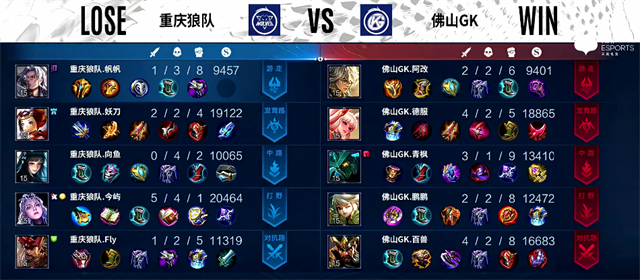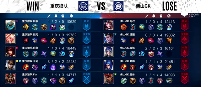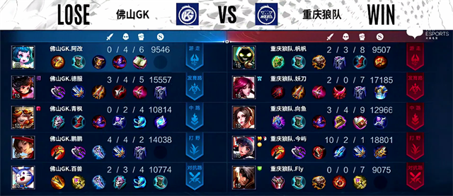 双方平稳开局。3分06秒镜拿下暴君,澜拿下主宰。8分04秒艾琳推掉下路一塔。5分30秒中路团战,猪八戒拿下一血。6分20秒艾琳被击杀。7分钟艾琳推掉中路一塔。7分17秒镜拿下主宰,澜拿下暴君。9分15秒野区团战,佛山GK打出1换2。10分25秒镜拿下主宰。11分12秒澜拿下暴君。15分20秒野区团战,佛山GK打出1换2。15分40秒艾琳拿下主宰。17分钟野区团战,佛山GK打出0换2。17分20秒镜推掉中路高地塔。17分30秒佛山GK团灭重庆狼队。17分38秒佛山GK推掉水晶率先拿下一分。