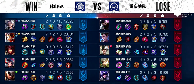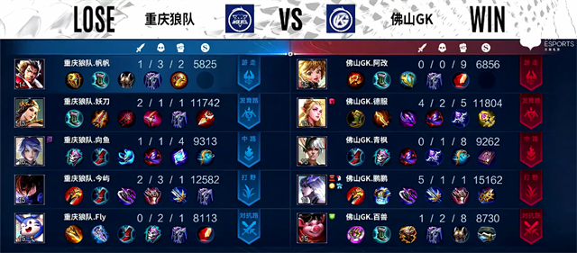 开局佛山GK入侵野区,张良拿下蓝Buff。3分钟露娜拿下暴君。4分30秒鲁班七号推掉下路一塔。5分钟中路团战,露娜拿下一血。6分30秒露娜拿下主宰。7分20秒露娜拿下暴君。9分12秒公孙离被击杀。9分25秒鲁班七号推掉上路一塔。9分50秒西施被击杀。10分40秒露娜拿下暴君,团战双方2换2,公孙离推掉中路一塔。14分24秒阿古朵拿下主宰。16分10秒主宰团,双方3换3。17分50秒公孙离推掉下路高地塔。18分56秒阿古朵拿下主宰。20分20秒阿古朵被击杀。21分01秒鲁班七号拿下风暴龙王。22分18秒鲁班七号推掉下路高地塔。23分20秒中路团战,佛山GK打出1换2。23分55秒公孙离推掉中路高地塔。26分钟野区团战,佛山GK团灭重庆狼队。26分30秒佛山GK推掉水晶拿下本场比赛胜利。