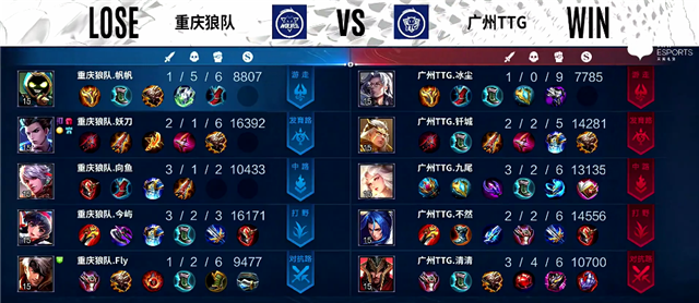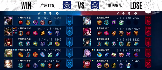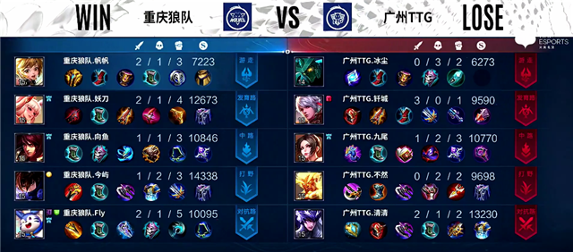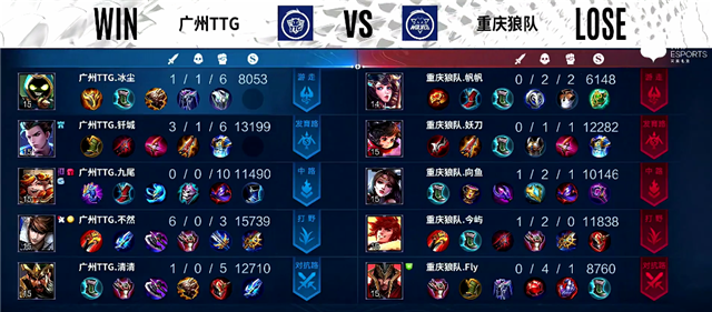 双方和平开局。2分10秒暴君团,艾琳拿下一血,广州TTG打出0换2,镜拿下暴君。4分10秒下路团战,艾琳被击杀。4分50秒弈星抢下主宰。5分17秒艾琳推掉下路一塔。6分17秒双方互换边路一塔。7分钟盘古拿下暴君。10分20秒暴君团,重庆狼队打出0换4,重庆狼队推掉中路防御塔。12分10秒中路团战,艾琳被击杀。13分钟盘古拿下暴君。14分47秒虞姬推掉上路高地塔。17分22秒虞姬拿下暴君。18分08秒盘古拿下主宰。19分钟虞姬推掉中路高地塔。20分40秒野区团战,重庆狼队打出0换2。21分04秒重庆狼队推掉水晶追平比分。