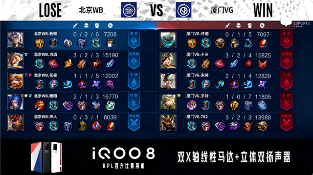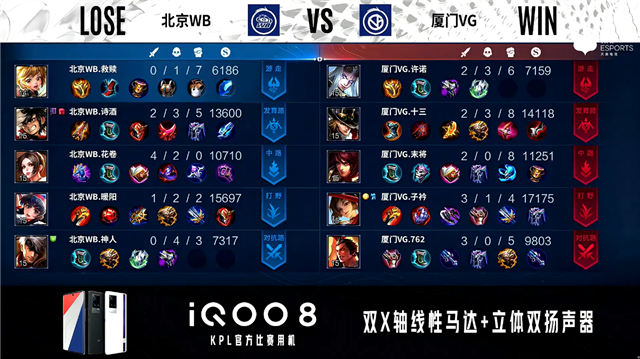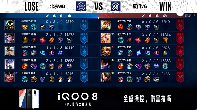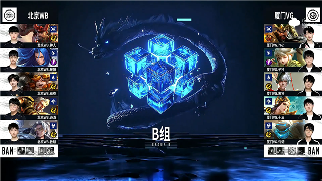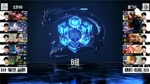 双方常规开局。55秒北京WB发育路击杀马可波罗拿到一血。1分25秒双方发育路1换1。2分11秒厦门VG拿下暴君。2分49秒厦门VG中路击杀夏侯惇。3分01秒北京WB野区击杀东皇太一。3分33秒北京WB摧毁敌方发育路外塔。4分38秒厦门VG拿下主宰。5分17秒野区团战北京WB击杀云缨。6分42秒北京WB拿下暴君。6分54秒厦门VG野区击杀夏侯惇。7分50秒发育路团战厦门VG击杀蒙犽。9分07秒主宰处团战厦门VG打出1换4。9分20秒厦门VG摧毁敌方中路外、二塔。10分51秒厦门VG拿下暗影暴君。13分02秒厦门VG拿下暗影主宰。13分13秒中路团战北京WB击杀东皇太一。15分48秒厦门VG拿下暗影暴君。17分53秒厦门VG拿下暗影主宰。19分29秒对抗路团战厦门VG打出1换3。20分16秒厦门VG摧毁敌方水晶拿下比赛。