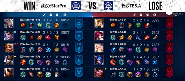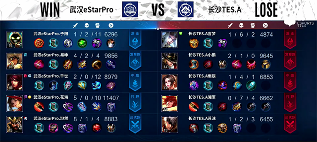 双方和平开局。1分32秒武汉eStarPro入侵野区,关羽拿下一血。2分13秒裴擒虎被击杀。2分30秒云缨拿下主宰。2分43秒武汉eStarPro入侵野区,双方1换1。3分13秒裴擒虎被击杀。3分20秒野区团战,东皇太一被击杀。4分钟云缨拿下暴君。4分50秒成吉思汗推掉下路一塔。5分30秒上路团战,武汉eStarPro打出1换2。6分钟成吉思汗推掉上路二塔。6分40秒野区团战,武汉eStarPro打出0换2。7分钟云缨拿下主宰。8分19秒成吉思汗推掉中路一塔。8分34秒成吉思汗推掉下路高地塔。9分10秒野区团战,武汉eStarPro打出1换3。10分20秒野区团战,武汉eStarPro打出0换2。10分35秒云缨拿下主宰。12分钟云缨拿下暴君。12分21秒裴擒虎被击杀。13分钟高地团,武汉eStarPro团灭长沙TES.A。13分10秒武汉eStarPro推掉水晶拿下本场比赛胜利。
