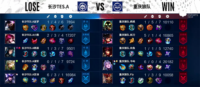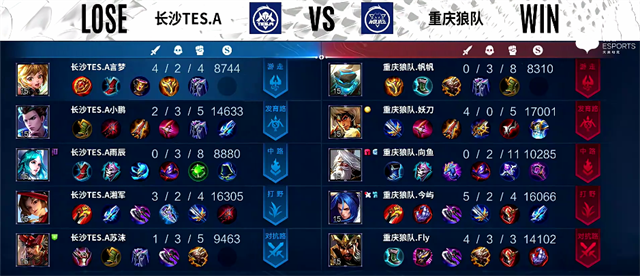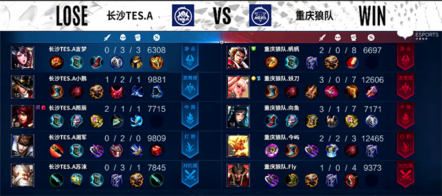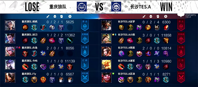 开局橘右京入侵野区拿下蓝Buff。1分10秒中路团战,橘右京拿下一血。2分10秒橘右京拿下暴君。4分50秒野区团战,长沙TES.A打出1换2。5分40秒狄仁杰推掉下路一塔。6分27秒橘右京拿下暴君。6分30秒野区团战,双方1换1。7分钟橘右京推掉上路一塔。7分40秒云缨拿下主宰,盾山被击杀。8分钟关羽推掉下路二塔。8分48秒河道团战,双方2换2。10分23秒橘右京拿下暴君。11分50秒成吉思汗抢下主宰,廉颇被击杀。12分20秒成吉思汗推掉中路二塔。14分30秒成吉思汗拿下暴君。16分20秒橘右京拿下主宰。17分50秒长沙TES.A中路高地塔被破。19分12秒狄仁杰拿下暴君。21分钟中路团战,重庆狼队团灭长沙TES.A。21分20秒重庆狼队推掉水晶拿下本场比赛胜利。