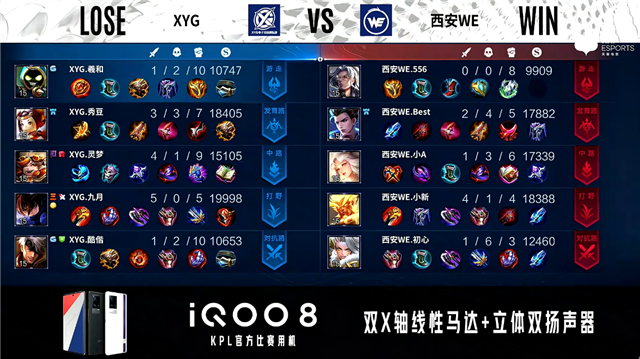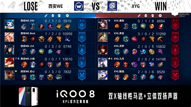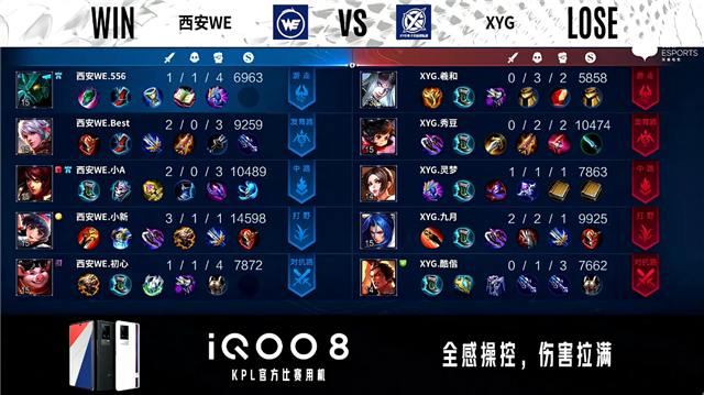 双方常规开局。1分12秒中路团战XYG打出1换3。2分06秒XYG野区打出0换2。2分30秒西安WE拿下暴君。2分57秒西安WE发育路击杀鬼谷子。4分36秒双方对抗路2换2。6分34秒西安WE中路击杀鬼谷子。7分02秒西安WE拿下暴君。8分54秒XYG野区击杀不知火舞。9分06秒西安WE摧毁敌方发育路二塔。11分29秒发育路双方1换1,西安WE对抗路越塔击杀王昭君。12分45秒西安WE拿下暗影主宰。13分25秒双方发育路1换1。13分55秒西安WE高地打出1换2。14分07秒西安WE摧毁敌方发育路高地塔。14分49秒西安WE拿下暗影暴君。16分02秒西安WE对抗路打出0换2。16分41秒西安WE摧毁敌方水晶拿下比赛。
