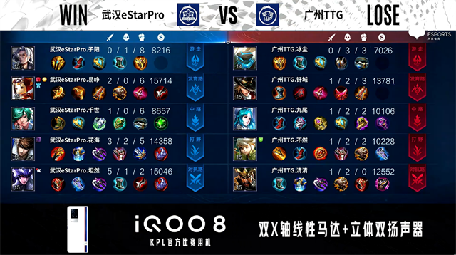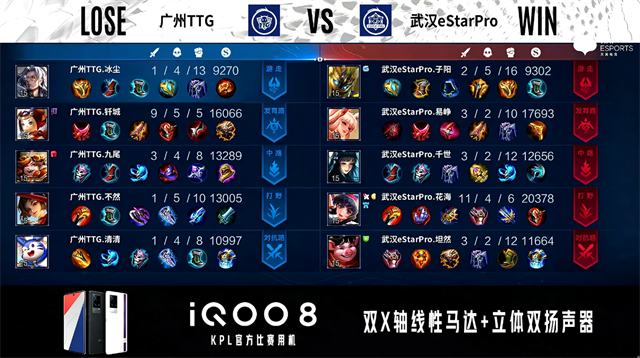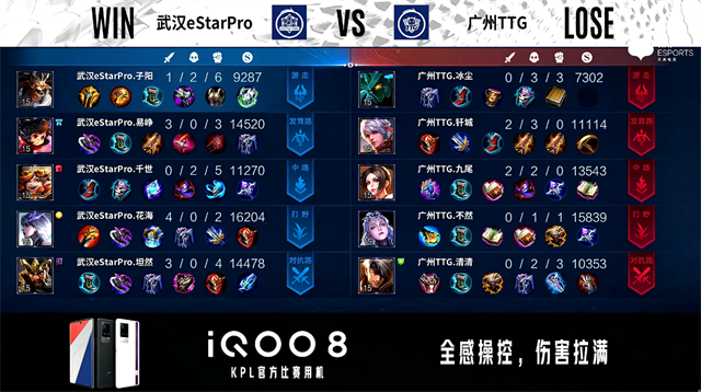 双方常规开局。1分07秒武汉eStar反掉蓝BUFF。1分18秒广州TTG中路击杀兰陵王拿到一血。1分43秒武汉eStar发育路击杀周瑜。2分21秒武汉eStar拿下暴君。3分03秒野区团战广州TTG打出3换4,蒙恬拿到三连决胜。4分50秒武汉eStar野区击杀澜。5分31秒武汉eStar拿下主宰。6分33秒主宰处团战广州TTG打出1换2。7分43秒中路团战广州TTG打出0换2。8分51秒武汉eStar摧毁敌方中路外塔。10分20秒武汉eStar拿下暗影暴君。11分57秒广州TTG野区击杀夏侯惇。13分42秒中路团战广州TTG打出1换2。14分42秒暴君处团战双方3换3。15分10秒广州TTG中路击杀不知火舞。15分57秒广州TTG对抗路打出0换2。16分48秒广州TTG打出1换2。18分07秒中路团战武汉广州TTG打出3换4。18分53秒广州TTG摧毁敌方水晶拿下比赛。