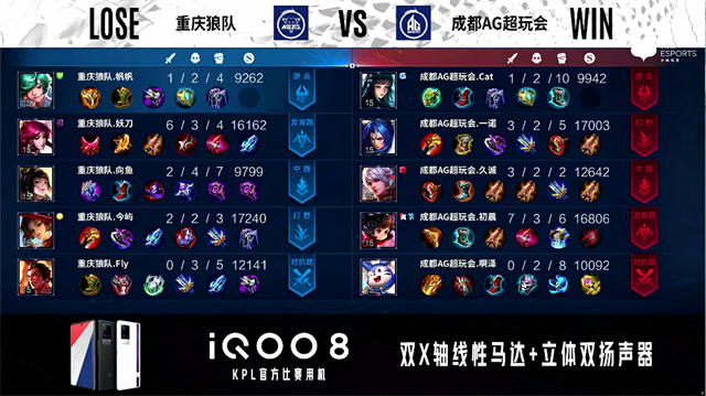 2分30秒,重庆狼队控下暴君。3分31秒,成都AG马可波罗下路击杀大乔拿下一血。5分34秒,重庆狼队上路打出0换2并破掉成都AG上一塔,镜拿下双杀。6分24秒,重庆狼队镜下路击杀娜可露露。6分41秒,重庆狼队破掉成都AG中一塔。7分05秒,重庆狼队控下暴君。8分22秒,双方团战3换3。8分57秒,成都AG破掉重庆狼队上一塔。10分12秒,双方2换2。10分52秒,重庆狼队控下暗影暴君。13分07秒,双方团,重庆狼队打出0换2。13分31秒,重庆狼队破掉成都AG中二塔。13分44秒,重庆狼队破掉成都AG上高地。14分10秒,重庆狼队赢下高地团,一波摧毁成都AG水晶拿下最终胜利!