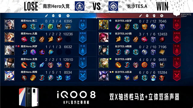 开局南京Hero边路换线。1分11秒长沙TES.A拿下中路河道之灵,南京Hero反掉敌方蓝BUFF。2分17秒发育路团战双方1换1。2分54秒南京Hero野区击杀嬴政。3分08秒南京Hero马可波罗野区分别单杀敌方澜与猪八戒拿到二连击破。5分10秒南京Hero拿下暗影主宰。6分18秒野区团战长沙TES.A打出0换3。7分35秒南京Hero拿下暴君。11分52秒南京Hero拿下暗影暴君并在后续团战打出0换2。13分14秒南京Hero拿下暗影主宰。16分49秒长沙TES.A野区击杀吕布。17分29秒野区团战南京Hero击杀澜。17分46秒南京Hero拿下暗影主宰。19分12秒长沙TES.A野区击杀镜。20分36秒野区团战南京Hero击杀蒙犽。21分01秒南京Hero拿下风暴龙王,长沙TES.A击杀镜。22分24秒长沙TES.A对抗路击杀吕布。24分16秒南京Hero野区击杀猪八戒。25分10秒长沙TES.A高地团战打出0换2,南京Hero摧毁敌方发育路高地塔。26分15秒南京Hero摧毁敌方发育路高地塔。26分58秒长沙TES.A摧毁敌方水晶拿下比赛。