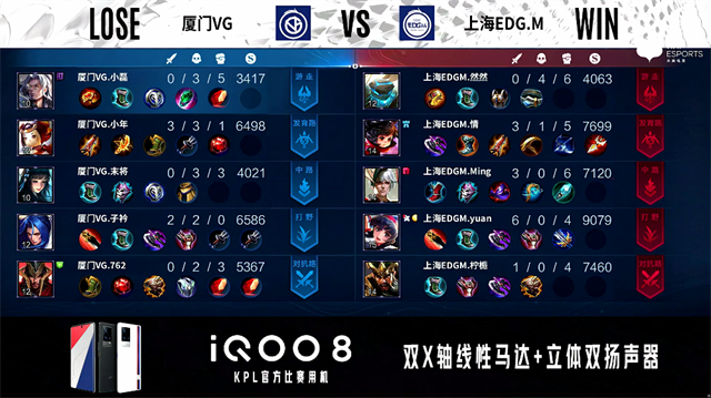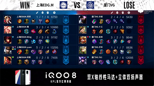 2分钟,双方团,厦门VG打出0换2。3分57秒,厦门VG下路击杀周瑜。4分53秒,上海EDG.M控下暴君。5分14秒,厦门VG破掉上海EDG.M上一塔,上海EDG.M破掉厦门VG下一塔。6分44秒,上海EDG.M破掉厦门VG上一塔。7分58秒,双方团,厦门VG打出2换5团灭对手。11分07秒,厦门VG控下暗影暴君。11分53秒,厦门VG破掉上海EDG.M中一塔。12分11秒,中路团,上海EDG.M打出2换3。13分20秒,双方团,上海EDG.M打出1换2。14分12秒,上海EDG.M控下暗影主宰。15分35秒,上路团,上海EDG.M打出0换3。16分钟,上海EDG.M破掉厦门VG上高地,随后一波摧毁厦门VG水晶赢下比赛。