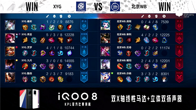 2分01秒,北京WB嬴政击杀越塔的鲁班七号拿下一血。2分40秒,北京WB控下暴君。4分32秒, XYG破掉北京WB下一塔。5分35秒,中路团,双方1换1。6分35秒,北京WB破掉XYG中一塔。7分25秒,北京WB破掉XYG上一塔。7分58秒,XYG越塔击杀马超,随后破掉北京WB上二塔。9分45秒,XYG控下先知主宰。10分钟,中路团,双方团,北京WB打出2换3,马超拿下双杀。11分39秒,A掉控下暗影暴君,随后北京WB马超破掉XYG上二塔。13分23秒,XYG控下暗影主宰。15分45秒,XYG破掉北京WB下二塔。16分17秒,XYG姜子牙大闪抢到暗影暴君,随后双方团战1换1。17分01秒,XYG破掉北京WB中一塔。17分45秒,XYG控下暗影主宰。16分10秒,XYG击杀马超。16分42秒,XYG上路包抄击杀北京WB下路双人组。19分25秒,XYG破掉北京WB上高地及中二塔。20分20秒,中路团,北京WB打出1换2。20分57秒,北京WB控下风暴龙王,团战打出0换2并破掉XYG中高地。21分35秒,北京WB团灭对手后摧毁XYG水晶扳回一城。
