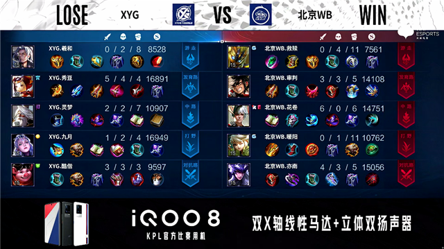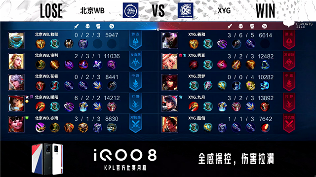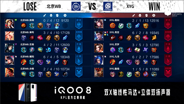 1分48秒,上、下路爆发交火,双方最终3换3。3分10秒,双方团,XYG打出1换2。4分钟,北京WB下路击杀兰陵王。4分24秒,北京WB拿下暴君。5分53秒,双方1换1。7分39秒,XYG破掉北京WB下一塔。10分42秒,XYG控下暗影暴君。11分45秒,XYG破掉北京WB上二塔。12分50秒,XYG娜可露露抢到暗影主宰,随后团战北京WB打出0换2。13分24秒,北京WB击杀公孙离并破掉XYG上二塔。15分06秒,北京WB控下暗影暴君。15分42秒,北京WB破掉XYG下二塔。15分56秒,双方团,XYG打出1换4。16分23秒,XYG破掉北京WB下高地。16分32秒,XYG破掉北京WB水晶赢下比赛。