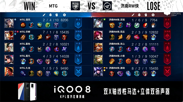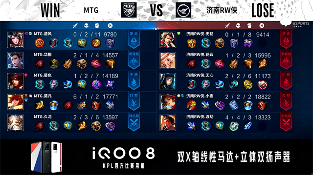 双方常规开局。1分07秒济南RW侠拿下中路河道之灵。1分18秒野区团战MTG击杀关羽拿到一血。1分30秒MTG中路击杀太乙真人。1分40秒济南RW侠中路击杀兰陵王。2分21秒暴君处团战MTG打出0换3。4分03秒济南RW侠主宰处打出1换2。4分25秒济南RW侠拿下主宰。5分31秒MTG野区击杀赵云。5分49秒主宰处团战MTG打出0换2。6分41秒中路团战双方1换1。8分42秒MTG拿下主宰。9分17秒野区团战双方2换2。10分41秒MTG拿下暗影暴君。12分04中路团战济南RW侠打出1换2。MTG摧毁敌方中路外、二塔。13分34秒MTG拿下暗影主宰。15分13秒MTG拿下暗影暴君。16分56秒济南RW侠打出2换3。18分10秒主宰处团战MTG打出1换5。18分42秒MTG摧毁敌方水晶拿下比赛。