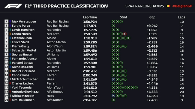2021年F1比利时大奖赛第3次练习赛成绩表: