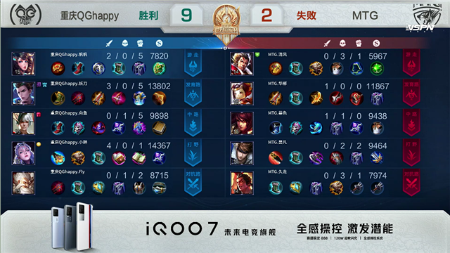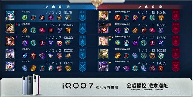 2分14秒,重庆QG拿下暴君。4分42秒,MTG破掉重庆QG下一塔。4分55秒,重庆QG大乔击杀赵云拿下一血。6分26秒,重庆QG破掉MTG下一塔。8分06秒,MTG击杀老夫子,但重庆QG破掉MTG下二塔。8分40秒,重庆QG击杀张飞。8分30秒,重庆QG击杀张飞随后破掉MTG上二塔。10分57秒,MTG拿下暗影暴君,重庆QG团战击杀吕布。11分34秒,重庆QG拿下暗影主宰。14分33秒,重庆QG击杀吕布。15分06秒,重庆QG破掉MTG中二塔。16分22秒,重庆QG打出0换2并陆续破掉MTG三座高地。16分47秒,重庆QG边团边拆破掉MTG水晶赢下比赛。
