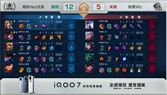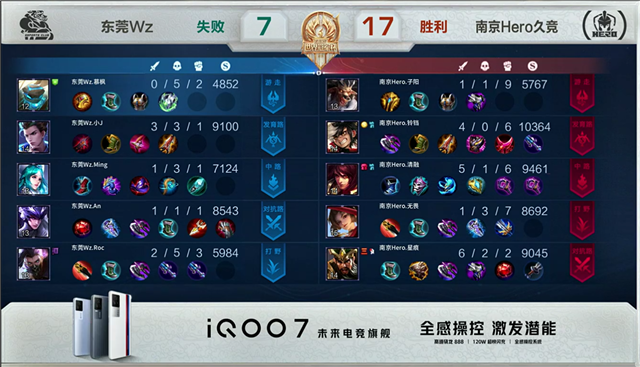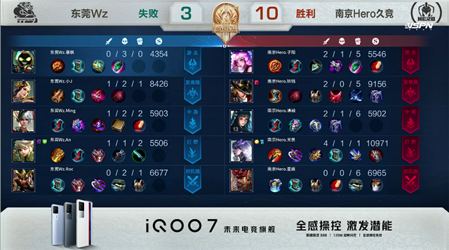 开局东莞Wz阿古朵反掉南京Hero红buff。2分13秒,南京Hero控下暴君。2分51秒,双方中路1换1。4分20秒,东莞Wz拿下先知主宰。5分13秒,下路团,南京Hero打出0换2。8分08秒,南京Hero破掉东莞Wz上二塔。8分58秒,南京Hero下路击杀太乙真人随后破掉东莞Wz下二塔。9分20秒,东莞Wz反打打出1换2。10分19秒,南京Hero拿下暗影暴君。11分08秒,中路团,南京Hero打出0换2,随后破掉东莞Wz中二塔及上高地。11分42秒,南京Hero边团边拆破掉东莞Wz水晶赢下比赛。