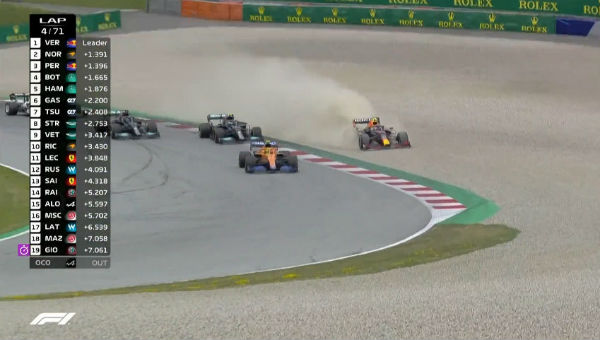 第4圈,安全车结束,比赛重启。博塔斯超越汉密尔顿,佩雷兹在与诺里斯的缠斗中,冲进缓冲区,排名掉到第十。第6圈,场上排名前十为:维斯塔潘、诺里斯、汉密尔顿、博塔斯、加斯利、角田裕毅、斯特罗尔、维特尔、里卡多和佩雷兹。里卡多在起步后已经上升4位。吉奥维纳兹由于在通过安全车线前完成了超车而接受调查。