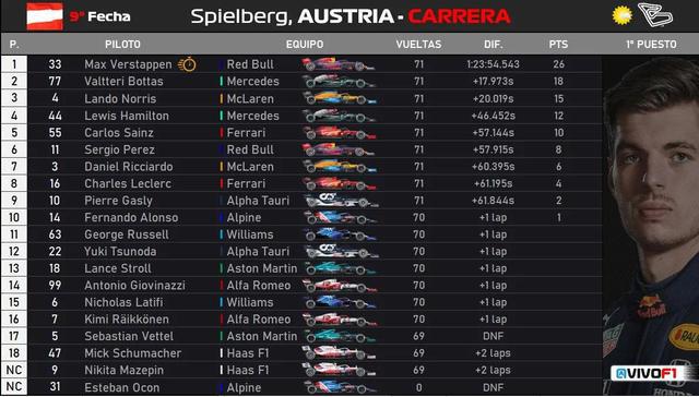 JRS直播网讯 北京时间7月4日晚,2021F1奥地利大奖赛正赛在红牛环赛道落幕。经过1个多小时的争夺,连续3站杆位发车的红牛车手维斯塔潘,在领跑全场后,斩获赛季三连冠。这是荷兰人生涯第50次登上领奖台,也是他的第15个分站冠军。梅奔车手博塔斯位列第二,收获本赛季最好排名。诺里斯拿到第三,赛季第三次登上领奖台。这三人也是本赛季首次同时登上领奖台。P4-P10分别为:汉密尔顿、塞恩斯、佩雷兹、里卡多、勒克莱尔、加斯利和阿隆索。迎来生涯第200场里程碑的佩雷兹,第三位发车却因罚时,最终收获第六。