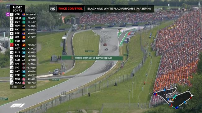 第52圈,博塔斯超越汉密尔顿,升至第二,而佩雷兹再次被罚时5秒。第54圈,诺里斯超越汉密尔顿,升至第三,后者随即进站,出来后依旧排名第四;同圈,斯特罗尔因在维修区内超速被罚时5秒。第56圈,角田裕毅再次因进站时压到维修区入口白线而被罚时5秒。第59圈,维斯塔潘以1分07秒835再次刷新最快圈速。