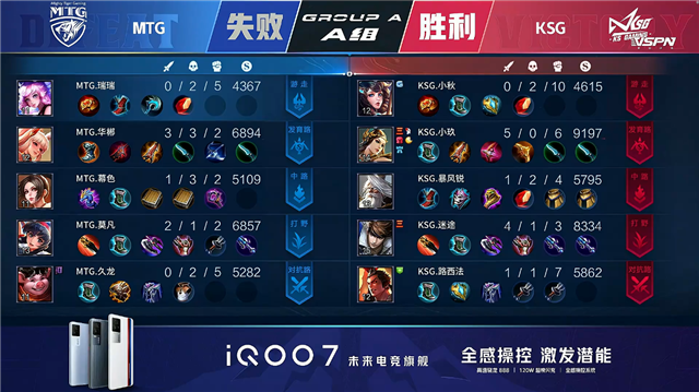 双方常规开局,1分14秒MTG拿到中路河道之灵。2分30秒MTG不知火舞野区单杀姜子牙拿到一血。3分05秒MTG拿下暴君。4分05秒KSG摧毁敌方下路外塔。4分36秒下路团战MTG打出0换3,赵云拿到三连决胜。4分52秒KSG拿下主宰。7分19秒下路团战MTG打出0换2。7分42秒MTG中路击杀赵云。7分55秒KSG中路击杀公孙离。8分16秒KSG摧毁敌方中路外塔。8分53秒野区团战KSG打出1换2。10分20秒上路团战KSG打出1换5,虞姬拿到三连决胜。10分49秒KSG摧毁敌方水晶拿下比赛。