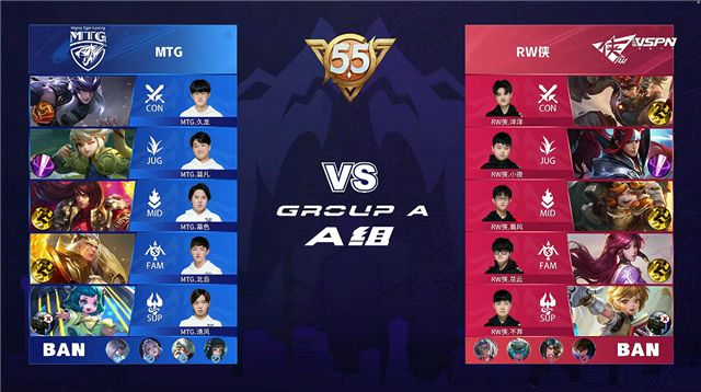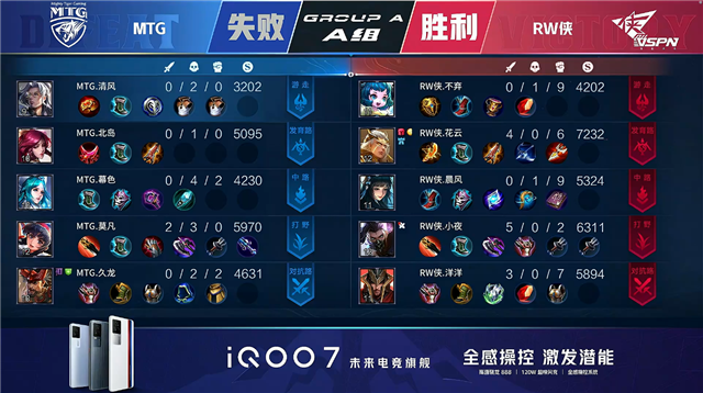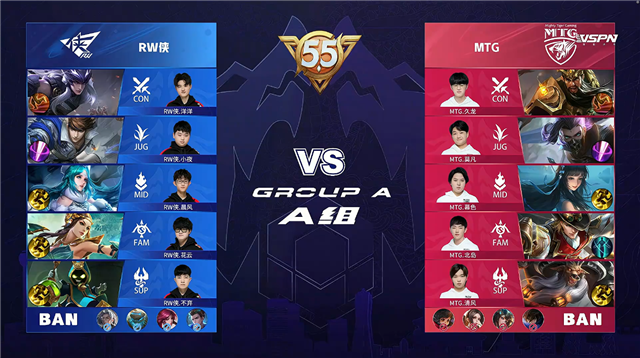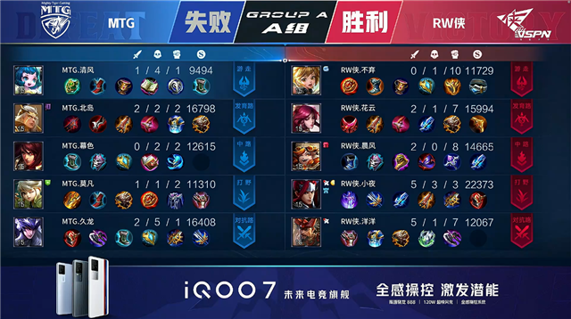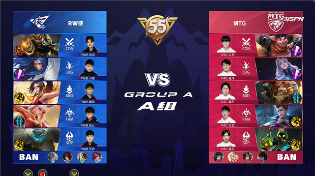 双方常规开局,1分12秒MTG拿下中路河道之灵。2分15秒RW侠击杀娜可露露拿到一血并拿下暴君。3分23秒RW侠中路击杀王昭君。5分35秒中路团战RW侠打出0换3。6分11秒野区团战RW侠击杀娜可露露。7分27秒RW侠摧毁敌方上路二塔。7分49秒RW侠拿下暴君。7分58秒MTG拿下主宰。8分20秒RW侠中路击杀王昭君。8分33秒RW侠摧毁敌方西路二塔。8分42秒RW侠打出0换2并摧毁敌方下路高地塔。9分10秒RW侠摧毁敌方水晶拿下比赛。