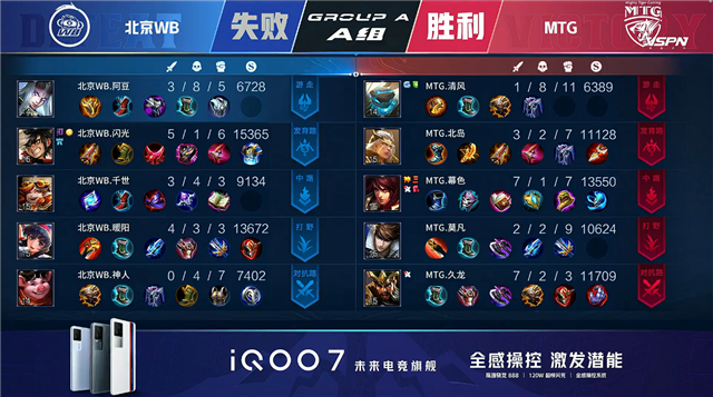 开局MTG入侵野区击杀沈梦溪拿到一血,1分10秒MTG拿下中路河道之灵。2分14秒MTG拿下暴君。3分27秒MTG中路反杀东皇太一。4分40秒下路团战MTG击杀东皇太一。5分32秒MTG拿下暴君,北京WB猪八戒与MTG赵云1换1,下路双方游走互换。6分35秒双方中路游走互换。7分01秒北京WB摧毁上路外塔。7分34秒北京WB下路打出0换2。9分17秒中路团战北京WB击杀盾山并摧毁敌方中路外塔。10分06秒上路团战双方2换2。11分04秒MTG下路击杀赵云。11分33秒MTG摧毁敌方中路外塔。12分46秒暴君处团战MTG打出2换4。13分28秒MTG摧毁敌方下路二塔。13分53秒MTG拿下暗影主宰。15分25秒野区团战双方1换1。16分35秒暴君处团战MTG打出2换5,周瑜拿到三连决胜,关羽拿到二连击破。17分04秒MTG摧毁敌方水晶拿下比赛。