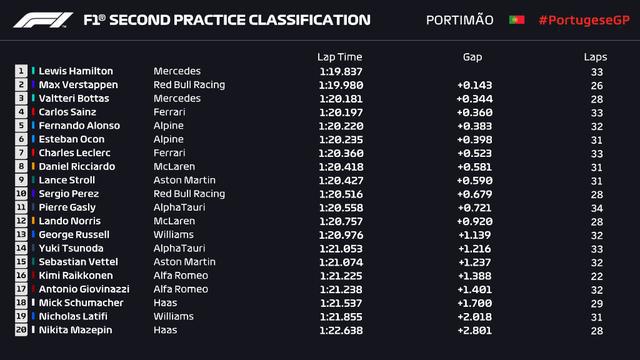 红牛F1车手马克斯·维斯塔潘以0.143秒之差排名第二,队友博塔斯以0.344秒的差距位居第三。