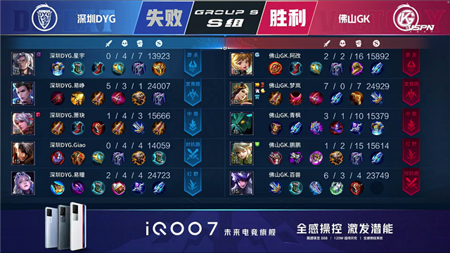 1分24秒中路团佛山GK马超击杀鲁班大师拿下一血,百里守约击杀孙膑,1分56秒佛山GK击杀夏侯惇。2分26秒佛山GK拿下第一条暴君,深圳DYG拿下先知主宰,4分40秒深圳DYG拆掉佛山GK下路一塔。5分05秒佛山GK马超被击杀,5分49秒佛山GK上路一塔被破。8分18秒深圳DYG拆掉佛山GK中路一塔,8分48秒团战双方1换1。9分54秒佛山GK击杀露娜,11分37秒佛山GK击杀百里守约拆掉深圳DYG中路一塔,12分15秒团战双方1换1,12分46秒深圳DYG拿下暗影暴君。13分06秒深圳DYG抢下暗影主宰,13分55秒深圳DYG打出0换2,拆掉佛山GK中路高地。18分20秒佛山GK上路二塔被破,19分45秒团战佛山GK打出0换4,20分22秒佛山GK拿下风暴龙王。21分10秒佛山GK拆掉深圳DYG上路二塔,23分23秒深圳DYG下路二塔被破。26分16秒深圳DYG拿下风暴龙王并击杀阿古朵,深圳DYG拆掉佛山GK下路高地。27分08秒佛山GK1换3守住水晶,30分14秒佛山GK拆掉深圳DYG下路高地,32分钟中路团佛山GK虞姬三杀,打出0换5团灭深圳DYG,一波拆掉水晶。