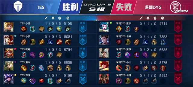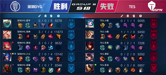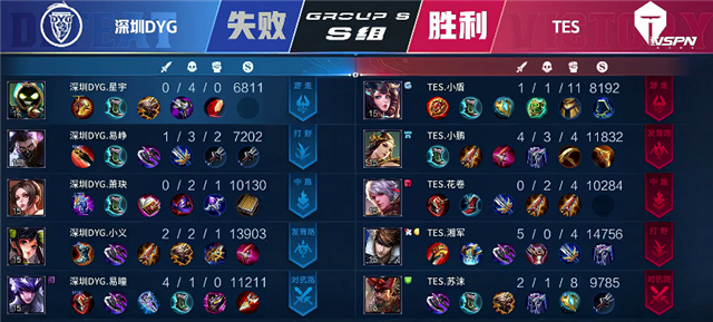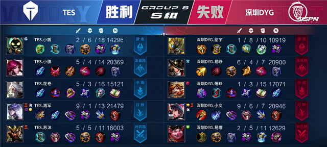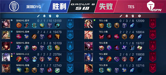 双方和平开局。2分29秒裴擒虎拿下暴君。3分钟下路河道交火,阿古朵拿下一血。5分钟双方互换边路一塔。8分13秒TES推掉上路一塔。8分30秒深圳DYG推掉下路一塔。8分50秒嬴政推掉中路一塔。9分48秒裴擒虎拿下主宰。11分30秒马超抢下暴君,团战TES打出0换4,马超拿下双杀。TES顺势下路一波推向高地。12分钟TES团灭深圳DYG推掉水晶拿下本场比赛胜利。