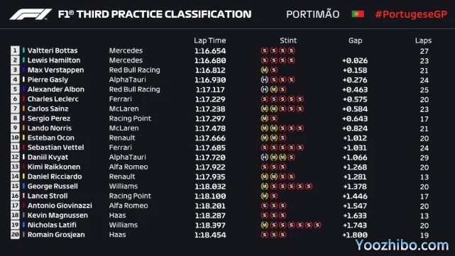 JRS直播网讯:北京时间10月24日晚,2020年F1葡萄牙大奖赛第三节自由练习赛结束,奔驰车手瓦尔特利·博塔斯以1分16秒654的成绩继续拿下全场第一,芬兰人包揽了所有三节自由练习赛的榜首位置。