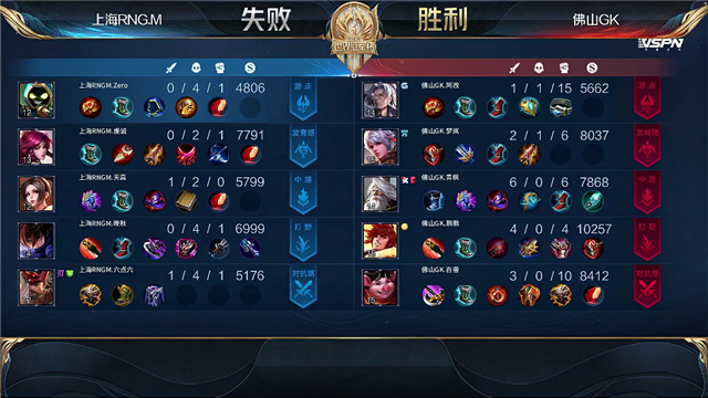 开局佛山GK入侵上海RNG.M野区反下红Buff,2分13秒佛山GK拿下先知主宰,上海RNG.M拿下暴君。5分27秒佛山GK击杀澜拿下一血,5分53秒佛山GK击杀廉颇。6分27秒佛山GK打出0换2,拆掉上海RNG.M中路一塔。7分35秒佛山GK拆掉上海RNG.M中路二塔击杀太乙真人,8分40秒上海RNG.M拆掉上海RNG.M上路高地击杀澜。9分50秒团战佛山GK打出0换2,10分10秒中路团佛山GK打出1换2。10分40秒佛山GK拿下暗影主宰,12分钟佛山GK拆掉上海RNG.M中路高地,团灭上海RNG.M一波拆掉水晶。
