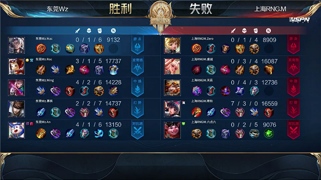 1分28秒东莞Wz元歌击杀沈梦溪拿下一血,2分钟上路团东莞Wz打出0换2。2分28秒东莞Wz拿下暴君,2分41秒上海RNG.M击杀元歌。4分钟东莞Wz拿下先知主宰,7分钟东莞Wz元歌单杀沈梦溪。7分19秒中路团战东莞Wz打出1换2,8分30秒团战上海RNG.M打出0换2。9分07秒东莞Wz鲁班七号被击杀,10分30秒上海RNG.M拿下暗影暴君,11分39秒东莞Wz拿下暗影主宰。15分15秒东莞Wz赵云被击杀,15分44秒上海RNG.M拿下暗影暴君。17分05秒上海RNG.M拿下暗影主宰,19分54秒上海RNG.M击杀鲁班大师。20分30秒东莞Wz打出0换3,21分57秒团战东莞Wz打出0换3。22分05秒东莞Wz拆掉上海RNG.M上路高地,强拆水晶拿下胜利。