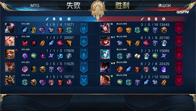 2分17秒,MTG拿下暴君。3分08秒,MTG兰陵王上路击杀吕布拿下一血。4分15秒,MTG拿下先知主宰。6分21秒,MTG入侵野区击杀澜。6分43秒,双方1换1。8分53秒,MTG三人中路集火击杀吕布。9分08秒,MTG拿下先知主宰。10分29秒,MTG拿下暗影暴君。11分57秒,MTG击杀李元芳。12分40秒,双方团,佛山GK打出0换3,随后破掉MTG下二塔及下高地。14分08秒,佛山GK破掉MTG上二塔。14分56秒,MTG拿到暗影主宰,随后团战佛山GK打出2换4。15分43秒,佛山GK破掉MTG中二塔。17分37秒,佛山GK击杀关羽。18分30秒,MTG破掉佛山GK上高地。18分40秒,佛山GK澜单杀兰陵王。19分15秒,佛山GK破掉MTG中高地。22分钟,双方团战1换1。23分04秒,佛山GK打出1换2。24分钟,佛山GK击杀关羽。24分30秒,佛山GK拿下风暴龙王。25分59秒,中路团,佛山GK反打打出1换2。29分13 秒,双方团,佛山GK打出0换4,随后一波摧毁MTG水晶。