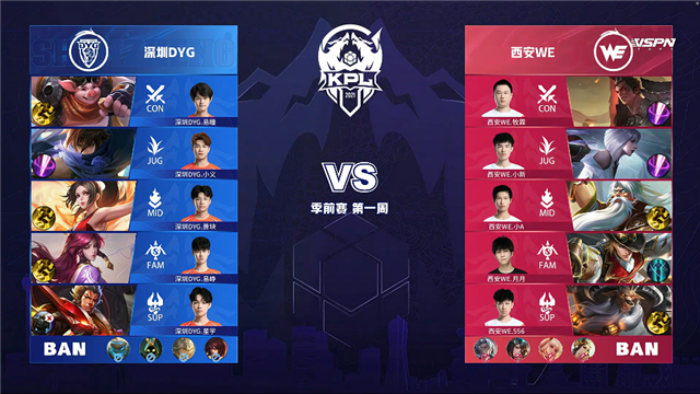 双方和平开局,3分46秒深圳DYG拿下第一条暴君,西安WE拿下先知主宰。4分33秒中路团深圳DYG鲁班大师击杀刘禅拿下一血,5分01秒深圳DYG拆掉西安WE下路一塔。6分钟上路团双方1换1,6分38秒西安WE不知火舞双杀,8分11秒西安WE拿下先知主宰。10分30秒暴君团西安WE打出0换4,11分10秒西安WE拿下暗影暴君。12分46秒深圳DYG击杀不知火舞,13分30秒上路团深圳DYG双方1换1,深圳DYG拆掉西安WE上路二塔。15分49秒深圳DYG拿下暗影暴君,16分25秒深圳DYG拆掉西安WE下路二塔。17分33秒西安WE拿下暗影主宰,20分钟下路团战深圳DYG打出0换3。20分41秒深圳DYG拆掉西安WE下路高地,22分钟团战深圳DYG打出2换4,狄仁杰拿到四杀。23分钟深圳DYG击杀不知火舞团灭西安WE,一波拆掉其水晶拿下胜利。