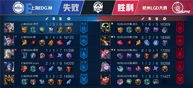 开局杭州LGD大鹅中路和上路换线。2分09秒娜可露露拿下暴君。4分钟娜可露露拿下主宰。5分20秒,娜可露露在中路拿下一血,同时上路强攻杭州LGD大鹅一塔,上海EDG.M打出1换2,马可波罗拿下双杀。5分30秒马可波罗推掉上路一塔。6分48秒,镜拿下暴君 。7分06秒,双方中路团战打出3换3,娜可露露拿下三杀。7分36秒,杭州LGD大鹅推掉上海EDG.M中路一塔。8分30秒杭州LGD大鹅主宰逼团,杭州LGD大鹅打出0换2。8分50秒,娜可露露在上路二塔被击杀,同时杭州LGD大鹅推掉上路二塔。10分30秒暴君逼团,杭州LGD大鹅打出2换3,镜拿下暴君。11分58秒,上海EDG.M拿下主宰。12分55秒,杭州LGD大鹅入侵红区,上海EDG.M打出1换2。13分47秒,上海EDG.M推掉中一塔。15分钟中路下河道团战,杭州LGD大鹅打出0换4。15分41秒,杭州LGD大鹅攻破水晶拿下本局比赛。