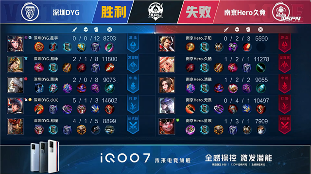 双方平稳开局,1分07秒南京Hero拿到中路河道之灵。2分10秒南京Hero拿下暴君。2分41秒南京Hero野区击杀娜可露露拿到一血。4分46秒南京Hero击杀虞姬并摧毁下路外塔。6分43秒深圳DYG拿下暴君。8分39秒南京Hero拿下主宰。9分整南京Hero野区击杀廉颇。9分59秒野区团战深圳DYG打出0换4。10分27秒深圳DYG摧毁敌方中路外、二塔。11分54秒上路团战深圳DYG打出0换2。12分40秒深圳DYG上路击杀镜并摧毁高地塔。13分44秒深圳DYG摧毁敌方下路二塔。14分12秒深圳DYG摧毁敌方下路高地塔。14分50秒深圳DYG娜可露露下路单杀镜。15分15秒深圳DYG拿下暗影暴君。15分40秒高地团战深圳DYG团灭对手摧毁水晶拿下比赛。