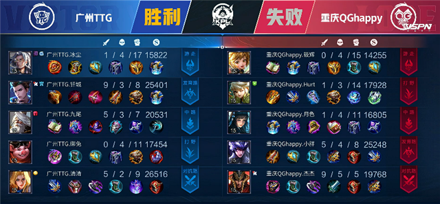 开局橘右京入侵蓝区拿下蓝buff。1分钟上路广州TTG越塔强攻,后裔拿下一血。2分30秒重庆QGhappy拿下暴君。3分56秒,双方互换边路一塔。4分37秒上河道团战,重庆QGhappy打出0换2。6分钟下野区团战,清清拿下双杀。7分钟广州TTG拿下暴君。7分44秒广州TTG越塔强攻,清清拿下双杀。8分10秒,中一塔再次团战,小胖被击杀,广州TTG推掉中一塔。9分30秒广州TTG入侵蓝区,小胖被击杀。10分15秒橘右京拿下黑暗暴君。11分广州TTG越塔强攻,清清被击杀。12分33秒广州TTG推掉上路一塔。12分48秒重庆QGhappy中路二塔处团战,双方1换1。13分07秒广州TTG拿下主宰。14分40秒广州TTG拿下黑暗暴君。14分47下路高地塔处月色被击杀。15分20秒广州TTG强攻水晶拿下本场比赛。
