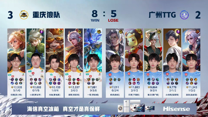 JRS直播网讯 2024年8月18日KPL夏季赛常规赛中,重庆狼队与广州TTG的比赛打得十分激烈,最终狼队以3-2的比分战胜了TTG。