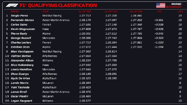 JRS直播网讯 北京时间05月07日,2023年F1迈阿密大奖赛排位赛结束,红牛车队佩雷兹夺得杆位,阿斯顿马丁车队阿隆索第二,法拉利车队塞恩斯排名第三。马格努森第四,加斯利第五,拉塞尔第六,勒克莱尔第七,奥康第八,维斯塔潘第九,博塔斯第十。