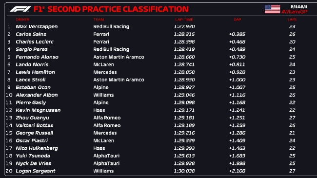 JRS直播网讯 2023年F1迈阿密大奖赛第2次练习赛结束,红牛车队维斯塔潘以1:27.930排名第一,法拉利车队塞恩斯落后0.385秒排名第二,他的队友勒克莱尔落后0.468秒排名第三。佩雷兹和阿隆索分列四五,排名六至十位的车手分别是诺里斯、汉密尔顿、斯托尔、奥康、阿尔本。