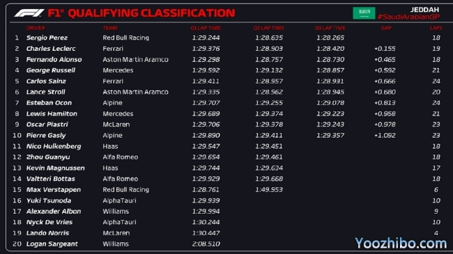 2023年F1沙特大奖赛排位赛成绩表: