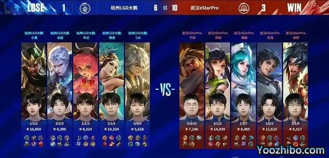 决胜局,杭州LGD大鹅蓝色方,拿到了凯+虞姬。武汉eStar红色方,拿到了曜+孙尚香。开局下路武汉eStar击杀虞姬,拿下一血。7分钟,杭州LGD大鹅虞姬输出拉满,拿下三杀,一波零换四,直推中路一塔。决胜团,武汉eStar控双龙,强推下路高地,一波零换四,直推水晶,拿下最终胜利!