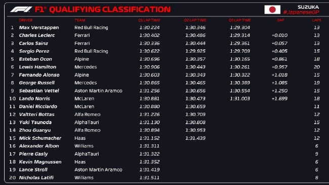 JRS直播网讯 北京时间10月08日,2022年F1日本大奖赛排位赛结束,凭借Q3第一个飞驰圈的出色发挥,红牛车队维斯塔潘顺利拿到日本大奖赛的杆位!法拉利车队勒克莱尔和塞恩斯两位法拉利车手分列第二和第三。