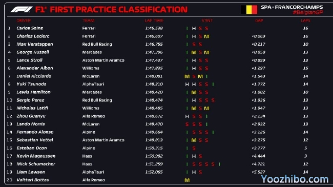 JRS直播网讯 2022年F1比利时大奖赛第1次练习赛在斯帕赛道结束,法拉利车队塞恩斯凭借1:46.538的成绩获得一练头名,他的队友勒克莱尔落后0.069秒位列第二,红牛车队维斯塔潘第三,落后0.217秒。拉塞尔与斯托尔分列四五。