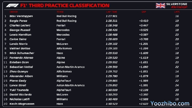 JRS直播网讯 2022年F1英国大奖赛第3次练习赛在银石赛道结束,红牛车队维斯塔潘1:27.901取得三练头名,他的队友佩雷兹第二落后0.410秒,法拉利车队勒克莱尔第三,他落后维斯塔潘0.447秒。两位梅赛德斯车手拉塞尔和汉密尔顿位列四五,第六至第十位分别是:塞恩斯、诺里斯、博塔斯、米克·舒马赫和阿隆索。