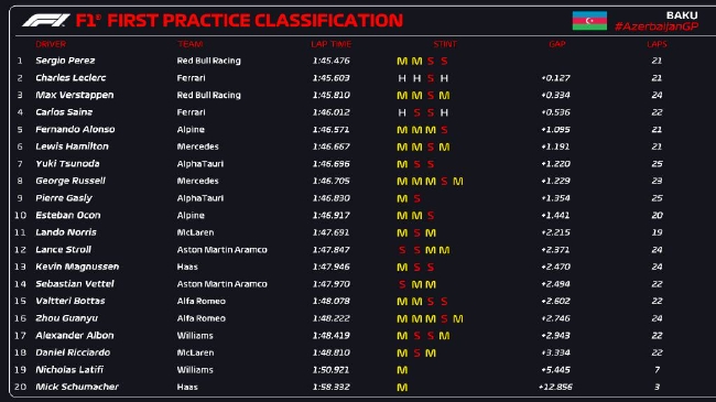 JRS直播网讯 2022年F1阿塞拜疆大奖赛第1次练习赛在巴库赛道结束,去年的阿塞拜疆大奖赛冠军得主佩雷兹以1:45.476排名第一,勒克莱尔落后0.127秒排名第二,维斯塔潘落后0.334秒排名第三,塞恩斯和阿隆索分列四五。排名六至十位的车手分别是汉密尔顿、角田裕毅、拉塞尔、加斯利、奥康。