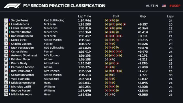 2021F1美国大奖赛二练最终成绩: