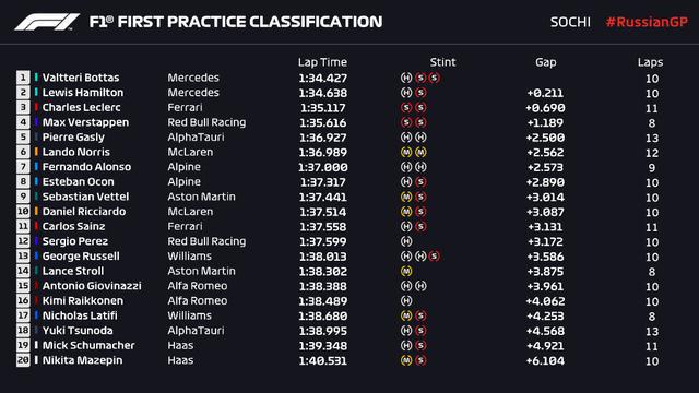 F1俄罗斯站FP1成绩: