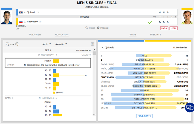第三盘,梅德韦杰夫再接再厉,首局就在0-30的情况下,连下4球,率先破发。第2局错失1局点保发后,他又在第3局30-40时,连下3球,挽救1局点,再度破发。顺利保发后,梅德韦杰夫取得了4-0的领先。此后3局双方各自保发。第8局,梅德韦杰夫在40-30拿到赛点时,出现连续双误,随着他的正手非受迫性失误,德约科维奇抓住这盘第1个破发点,拿到本场比赛唯一1局破发。第10局,梅德韦杰夫在40-15拿到2个赛点后,再次出现发球双误,不过最终,随着德约科维奇1记反手受迫性失误,梅德韦杰夫在全场第3个赛点时,终于拿下了发球胜赛局,以6-4再胜一盘,大比分3-0横扫德约科维奇,赢得了职业生涯首个大满贯男单冠军。整盘用时45分钟。