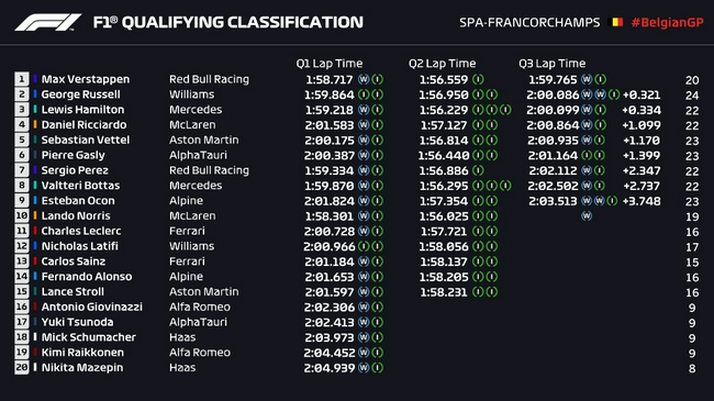 JRS直播网讯 北京时间08月28日,2021年F1比利时大奖赛排位赛在斯帕赛道结束,经过一场雨战,红牛车队维斯塔潘最后时刻超越了威廉姆斯车队拉塞尔夺得杆位,拉塞尔第二职业生涯首次头排发车。梅赛德斯车队汉密尔顿第三。里卡多、维特尔、加斯利、佩雷兹、博塔斯、奥康和诺里斯分列四至十位。