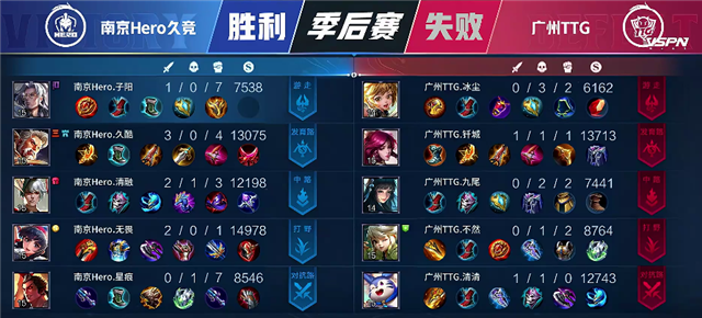 双方和平开局。2分31秒橘右京拿下暴君。3分40秒娜可露露拿下主宰。4分35秒南京Hero久竞推掉中路一塔。6分10秒广州TTG下路一塔被破。6分45秒下河道团战,嬴政拿下一血。7分09秒吕布拿下暴君。8分22秒橘右京拿下主宰。8分45秒上路团战,娜可露露被击杀。10分19秒橘右京拿下主宰。10分35秒下河道团战,周瑜被击杀。10分55秒暴君团,太乙真人被击杀。11分45秒南京Hero久竞强攻下路二塔,嬴政被击杀。12分钟南京Hero久竞推掉下路高地塔和中路二塔。12分15秒中路团战,后羿被击杀。13分40秒广州TTG入侵野区,橘右京被击杀。14分16秒娜可露露拿下暴君。14分50秒后羿拿下主宰。16分20秒南京Hero久竞推掉中路高地塔。18分30秒下河道团战,太乙真人被击杀,后羿拿下暴君。18分50秒南京Hero久竞推掉上路高地塔,顺势一波强攻水晶。19分21秒南京Hero久竞推掉水晶再拿一分。