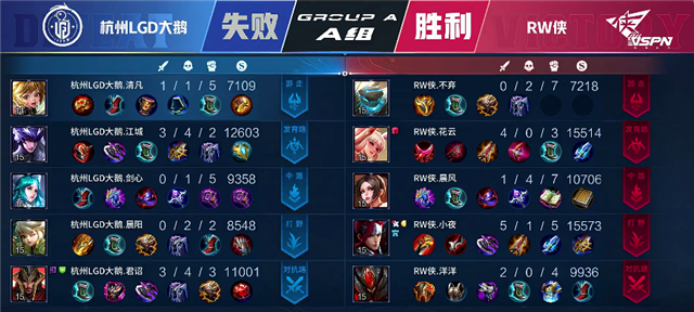 RW侠开局入侵野区没能拿到野区资源。2分20秒RW侠拿下主宰,杭州LGD大鹅拿下暴君。3分钟RW侠强攻下路一塔,嫦娥拿下一血和双杀。3分27秒伽罗推掉下路一塔。5分25秒伽罗推掉上路一塔。5分40秒杭州LGD大鹅中路一塔被破。7分钟中路团战,RW侠打出0换2。8分05秒嫦娥拿下主宰。9分钟RW侠中路越塔强攻,团战RW侠打出0换2。9分40秒杭州LGD大鹅中路二塔被破。10分10秒RW侠拿下暴君。10分58秒橘右京拿下主宰。11分40秒中路团战,RW侠打出1换2,RW侠推掉中路高地塔。14分06秒RW侠推掉下路高地塔。14分44秒RW侠拿下暴君。15分钟RW侠强攻高地,伽罗拿下双杀。15分18秒RW侠攻破水晶率先拿下赛点。